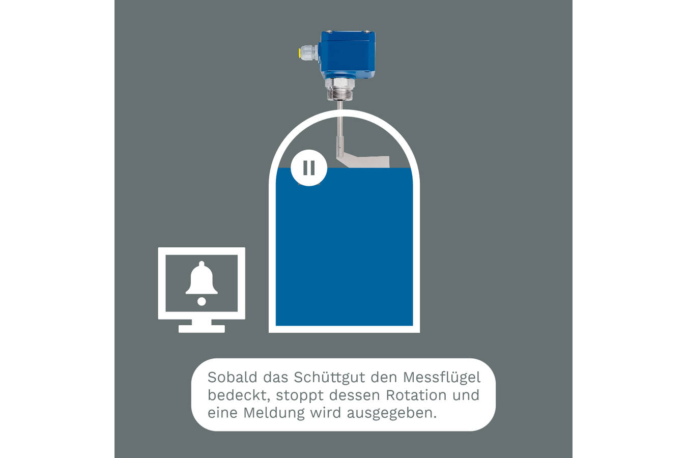 Der Rotonivo® Drehflügelschalter wird je nach Anforderung als Voll-, Bedarfs- oder Leermelder in Lagersilos oder Prozessbehältern eingesetzt und ist für den Einsatz in nahezu allen Schüttgütern geeignet. Mit seinem einfachen elektromechanischen Messprinzip kann er auch für extreme Prozessbedingungen angepasst werden. Eine motorisch angetriebene Welle versetzt die Schaufel in Rotation. Erreicht der Füllstand die Schaufel und verhindert damit eine weitere Drehung, entsteht ein Drehmoment, das über einen Schalter in ein elektrisches Signal umgewandelt wird. Sobald die Schaufel wieder frei vom Material ist, wird das Ausgangssignal zurückgesetzt und die motorgetriebene Welle dreht sich wieder.