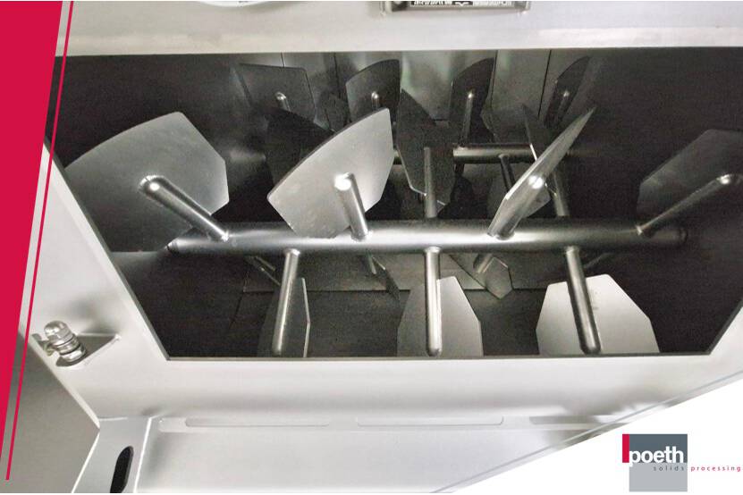 Die Versuchsanlage in Pöth verfügt über einen Zweiwellen-Paddelmischer mit Flüssigkeitszugabe. Zerstäubungsdüsen verteilen die Flüssigkeit fein über das fluidisierte Pulverbett, so dass innerhalb von 50 Sekunden eine Trockenmischung mit einer Homogenität von 1:100.000 erreicht wird.
