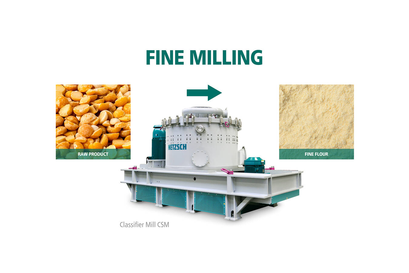 Der Prozess beginnt nach der Reinigung und Schälung der Hülsenfrüchte. Durch das Mahlen werden die relativ großen Stärkekörper von den kleineren Eiweißanteilen abgetrennt. Darüber hinaus sollte die Beschädigung der Stärke vermieden werden, um ihre Qualität zu erhalten. Am effektivsten und schonendsten wird dies durch die Prallmahlung in einer NETZSCH-Sichtermühle CSM erreicht. Eine Feinheit von etwa 40 - 60 µm (d90) des gewonnenen Mehls ist ideal.