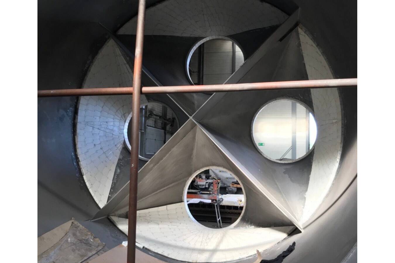 Im Bereich der Schlackengranulierung fertigte Kalenborn zudem alle Zu- und Ablaufleitungen zum Drehverteiler und schützte diese mit Kalocer und der Zirkonkorundkeramik KALCOR. Ebenso kleideten unsere Monteure im Rahmen eines Stillstandes das Einlaufrohr im Granulierturm neu mit Kalocer aus. Der Kunde lobte die Passgenauigkeit des Drehverteilers und das Montageteam, das ihm jederzeit hilfreich zur Seite stand.
