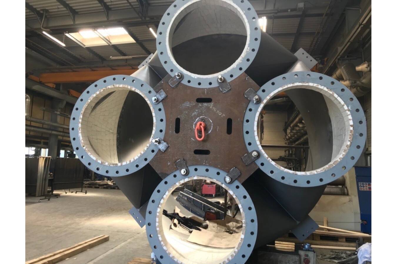 Kalenborn fertigte den Drehverteiler für Schlackensand und kleidete diesen zum Schutz gegen Verschleiß mit Kalocer aus.
