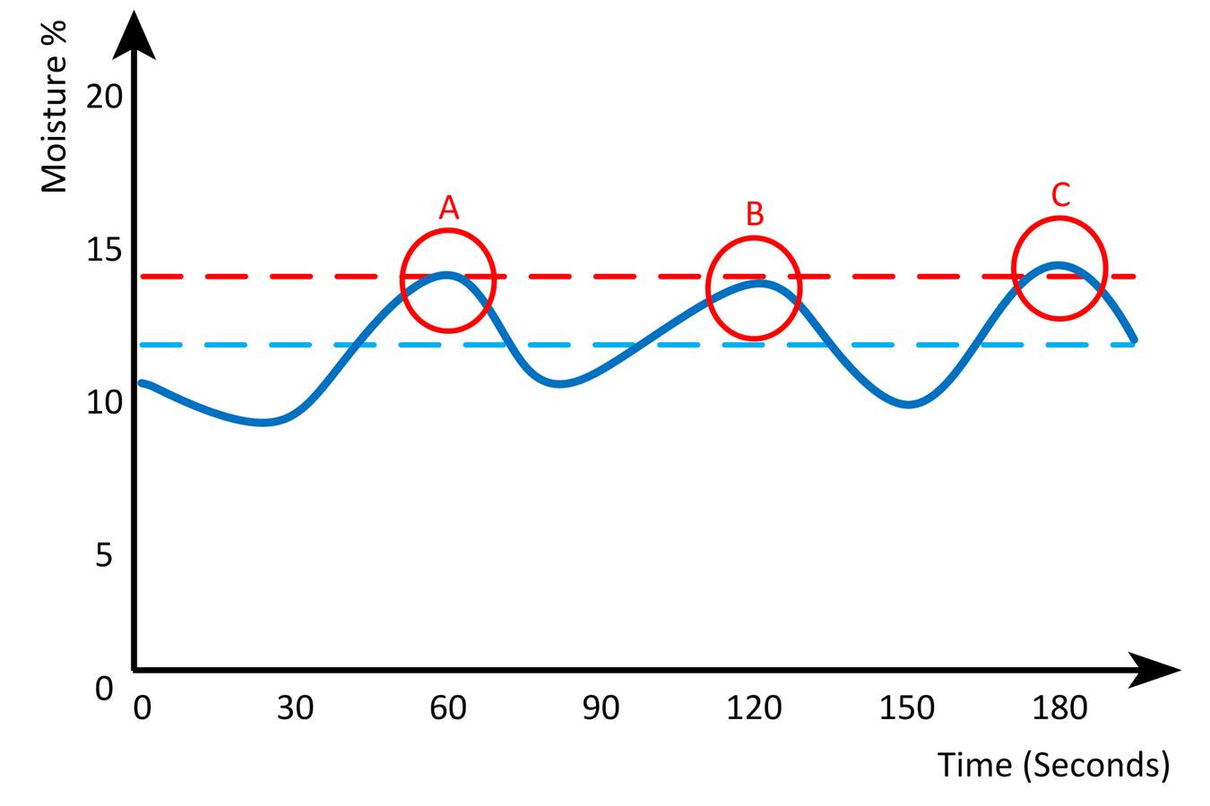 Beispielsweise kann der Feuchtigkeitsgehalt von Rohgetreide aus einem landwirtschaftlichen Betrieb zwischen 19% und 25% variieren. Siehe Grafik: Wenn drei Materialproben an den mit roten Kreisen markierten Punkten entnommen würden, läge der Durchschnitt der drei Proben bei etwa 24%.
