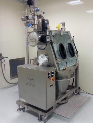 Bei der Aufgabe oder dem Entleeren der Gebinde können Betreiber auf verschiedene Systeme zurückgreifen. Die in Fässern gelieferten Pulver sind zum Bediener- und Produktschutz zusätzlich in zwei Folien, auch Liner genannt, verpackt. Je nach baulichen Gegebenheiten des Anlagenbetreibers beziehungsweise nach Spezifikationen und Anforderungen, ist das Entleeren mittels Schwerkraft und Kippvorrichtung, oder aber mit Hilfe einer Sauglanze möglich. Bei der Variante mit Kippvorrichtung wird das Fass durch eine spezielle Hubvorrichtung auf der Rückseite der Glovebox angehoben und an dem vorgesehenen Anschluss-Port angedockt. In der Ausgangsstellung verschließt ein Restliner die Glovebox. Der Anwender fixiert den äußeren Folienschlauch am Doppel-O-Ring-Port des Isolators über den Restliner. Im Anschluss zieht der Bediener den Restliner mit den Gloves in den Isolator hinein. Nun zieht er den Spannring an die äußere Nut des Isolators, an der sich zuvor der Restliner befand, und schiebt die Fassöffnung in den Isolator. Im Isolator öffnet er den inneren Liner und leert den Inhalt mit Hilfe der Gloves. Durch die Glovebox kann das Schüttgut nun mittels Schwerkraft zum nächsten Prozessschritt gelangen. Selbstverständlich kann - falls gewünscht - alternativ am unteren Ende des Trichters ein Absaugschuh zum Anschluss an eine nachgelagerte Vakuumförderung integriert werden. Nach dem Entleeren des Inhalts wird der Folienschlauch mittels Doppelverschluss zum Fass und Isolator abgedichtet. Durch diese Doppelverschlusstechnik ist sowohl der Isolator als auch das Produkt vor unerwünschten Produktaustritt – oder auch -eintritt – geschützt.
