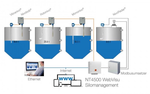 In Lagerprozessen lässt sich der NivoRadar® ebenfalls ohne weiteres mit dem Visualisierungssystem Nivotec® verbinden und bietet eine gute Kombiniermöglichkeit als Element zur Füllstandbestimmung. Die Datenvisualisierung liefert die detektierten Füllstände in Höhe, Prozent, Gewicht oder Volumen. Es werden Trends gespeichert, E-Mails über Füllstände oder Silovollmeldungen können aktiviert werden.
