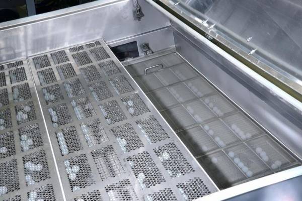 Blätter, deren Größe exakt der Maschenweite des Siebgewebes entspricht, können sich als Steckkorn verklemmen und das Gewebe zusetzen, was sich negativ auf die Durchsatzleistung auswirkt. Daher wurde der JEL Freischwinger zusätzlich mit einer Kugelabreinigung ausgestattet. Kugeln die auf einem Wellengitter unterhalb der Siebeinleger liegen, werden durch die horizontale Siebbewegung ins Rollen gebracht und reiben an der Unterseite des Gewebes, wodurch sich festsitzende Partikel lösen. Um Staub auf dem unteren Siebdeck ohne Demontage des oberen Siebeinlegers abzusaugen, wurde das Langhubsieb zusätzlich mit Makrolon-Fenstern ausgestattet.
