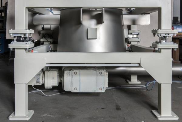 Das Produkt gelangt nach der Big Bag Entleerung direkt in eine Ausräumvorrichtung, die von Engelsmann speziell zum Austragen schwerfließender Schüttgüter konzipiert wurde. Das Methacrylamid rutscht durch die negativ konische Ausbildung des Behälters nach unten und wird mit Hilfe der Austragarme ständig zur Auslauföffnung transportiert. Die Ausräumvorrichtung bricht die vom Balkendruckmodul vorzerkleinerten Klumpen auf, sodass das Produkt wieder in seiner ursprünglichen kristallinen Form vorliegt und im Rührbehälter weiterverarbeitet werden kann. Da die Entleerstation nicht direkt über dem Rührbehälter installiert werden konnte, wird das Produkt über einen Schneckenförderer aufgenommen und dem Rührbehälter zugefördert.