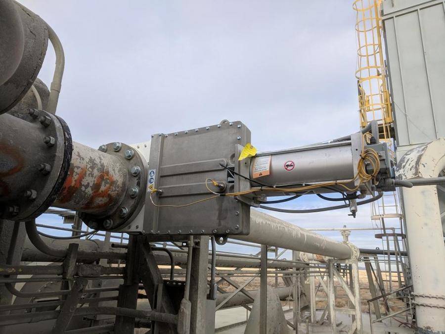 Der HDPV2 Schieber wurde nach Kundenwunsch mit einem Durchmesser von 355 mm gefertigt und geliefert. Dieser Schieber von Vortex ist in der Lage Materialtemperaturen bis zu 121° Grad im Dauerbetrieb bewältigen zu können. Durch Modifikationen des Schiebers kann man auch Materialtemperaturen von 232° Grad abbilden. Aus diesem Grund war die vorliegende Prozesstemperatur beim Produkt Zementpulver kein Problem.