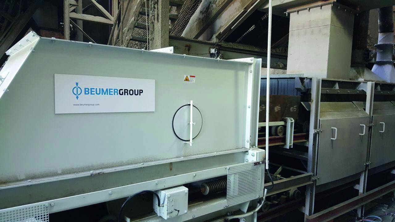 Mit ihren Stahlzellenförderern hat die Beumer group robuste und zuverlässige Lösungen im Programm. Die spezifische Ausführung der Zellen ermöglicht den sicheren Transport jeglichen Heißguts auf verschleißarme Art. Abgedichtete und überlappende Seitenwände sowie Bodenbleche der Zellen verhindern, dass der Klinker austreten kann, und minimieren den Staubdurchfall. In diesem Förderer kommt als Zugorgan in der Regel eine robuste Ein- oder Zweistrang-Doppellaschenkette zum Einsatz. Statt einer Kette bietet der Systemlieferant als einziger Hersteller auf dem Markt die Stahlzellenförderer auch mit den bewährten Beumer stahlseilgurten aus der Becherwerkstechnik als Zugorgan an. Dabei sind die Zellen so auf dem langlebigen und mit Stahlseilen verstärkten Gurt befestigt, dass sich die Wärme des in den Stahlzellen liegenden Klinkers nicht auf den Gurt übertragen kann. Im Aufgabebereich unterhalb des Kühlers wird der Gurt im Untertrum mit zur Wartung leicht demontierbaren Schottblechen gegen heißen Klinker im Falle eines Ofenschusses geschützt.
