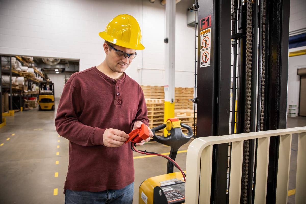 Die bedienerfreundliche Stromanschluss-Verriegelung BatteryBlock eignet sich für zahlreiche Industriefahrzeuge ist eine hervorragende Ergänzung in Ihrer Sicherheitsausstattung für Wartungsarbeiten.