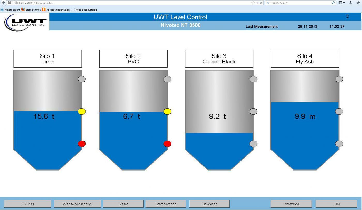 Auf jedem Silo einer Bäckerei wird das wartungsfreie Lotsystem Nivobob 4000 zur Füllstandüberwachung angebracht. Zur einfachen Montage ist lediglich eine übliche 1,5 Zoll Gewindemuffe im Silodach nötig. Die Füllstandsignale werden in der Bäckerei mithilfe der UWT-Software Nivotec und einem Wago-Webcontroller gebündelt und per Ethernet-Anschluss über eine geroutete IP-Adresse ins Internet eingespeist. Von der Mühle aus ist über die definierte IP-Adresse jederzeit der Zugriff auf die aktuellen Füllstände per Passwort und Internetbrowser gewährleistet. Es können - ohne weitere Hardwarekosten in der Mühle - beliebig viele weitere Kunden ins System aufgenommen werden.