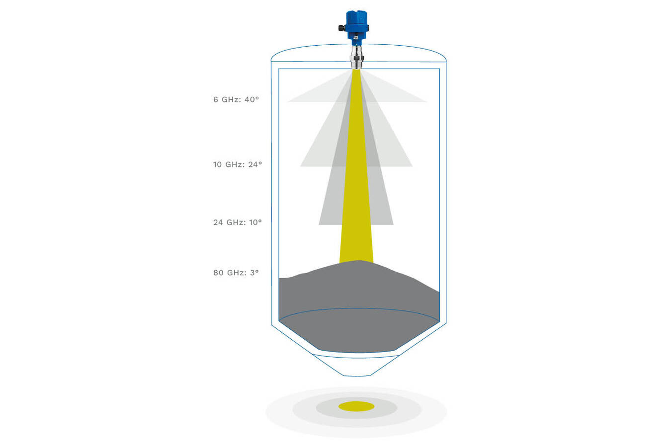 Das ermöglicht präzise Messungen auch in engen Behältern oder bei komplexen Einbauten. Die Strahlkeule hängt direkt von der Frequenz und Antennengröße ab: Je höher die Frequenz, desto fokussierter das Signal. Antennen mit kleinem Öffnungswinkel lassen sich zudem näher an der Behälterwand installieren und minimieren Störreflexionen – etwa durch Rührwerke oder andere interne Strukturen.